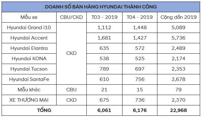 Hyundai Thành Công với doanh số bán hàng hơn 6.176 xe bán ra trong 4 tháng đầu năm 2019, tăng trưởng 2% so với tháng 3/2019.